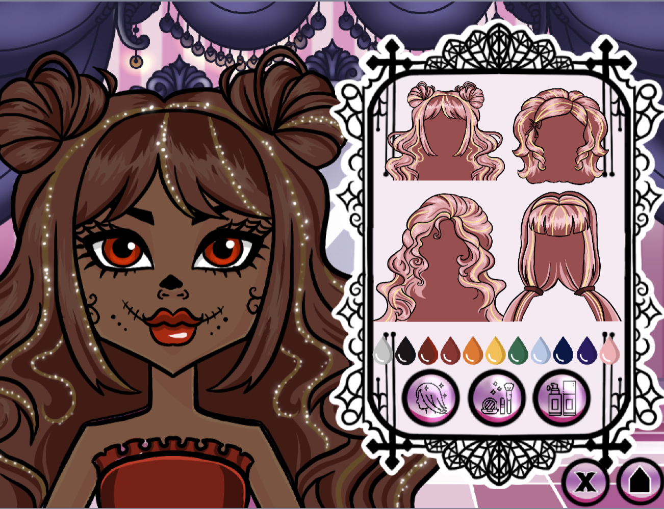 Step into Spooky Studio, a retro-inspired dress-up game where you run your own virtual beauty salon! Customize your character with endless combinations of hair, makeup, and contact lenses to create the perfect spooky look.